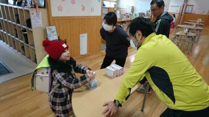 登校後すぐに手指の消毒や,マスクの確認を行いました。