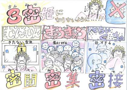 7・8日と子どもたちは登校しましたが、11日からまた臨時休業が延長され、新型コロナの勢いがまだまだ収まらない感じですが、子どもたちも含め学校として少しでも感染予防対策を強化し、早く収束されることを願い、生徒指導担当の先生を中心に手書きでポスターを作り、校内3か所に掲示しました。
