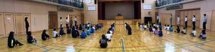 1学期は、全校朝会や終業式も校内放送で実施していましたが、町内はもちろん、近隣町村も感染者が出ていないことから、感染予防対策(ソーシャルディスタンス、換気、消毒等)を講じることで、体育館に全校児童が一堂に会しても大丈夫と判断しました。